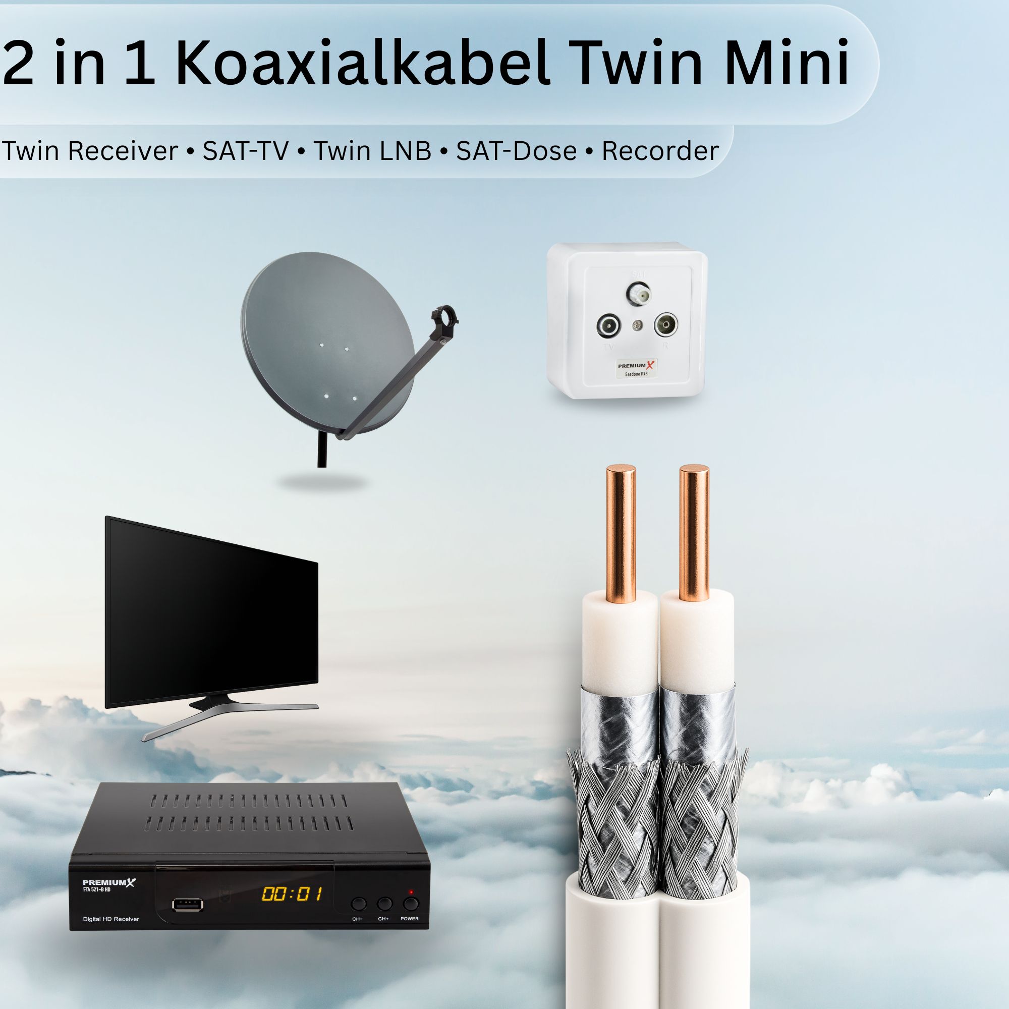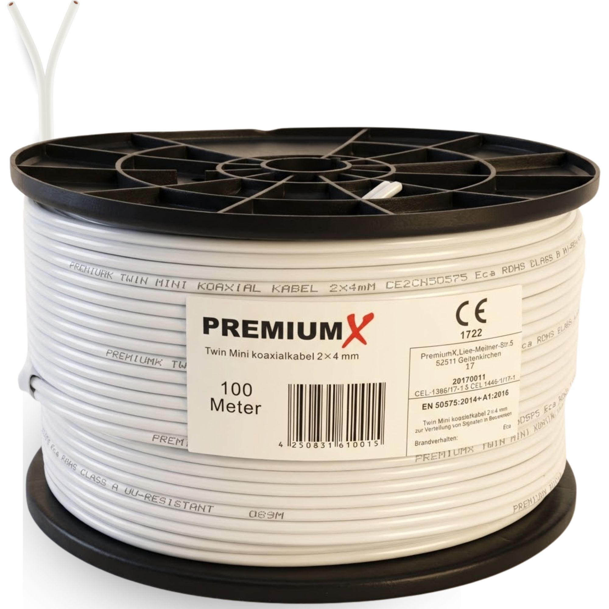 PremiumX 100m Sat Koaxial Kabel 90dB Twin Mini 2 x 4mm Weiß Antennenkabel 2-fach geschirmt