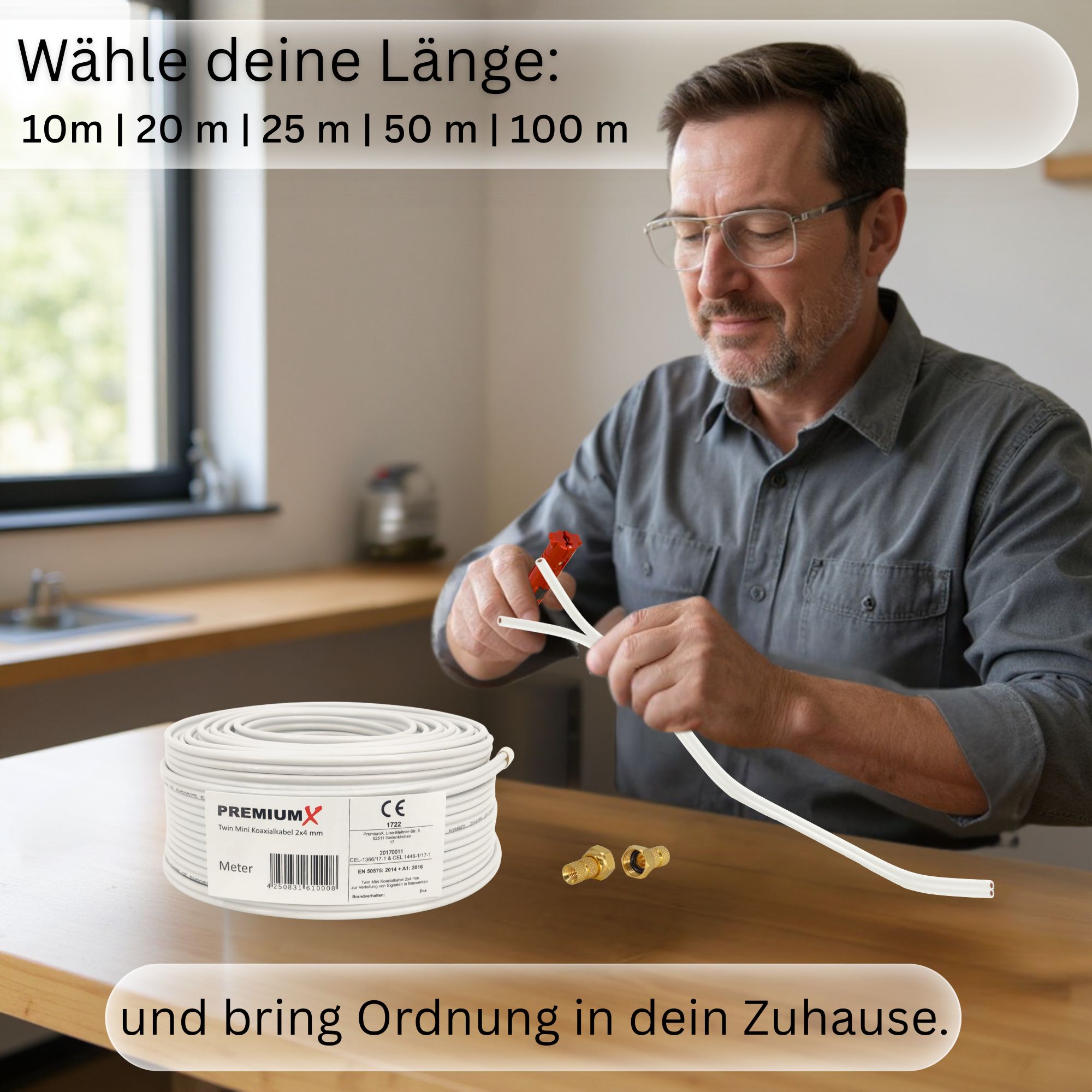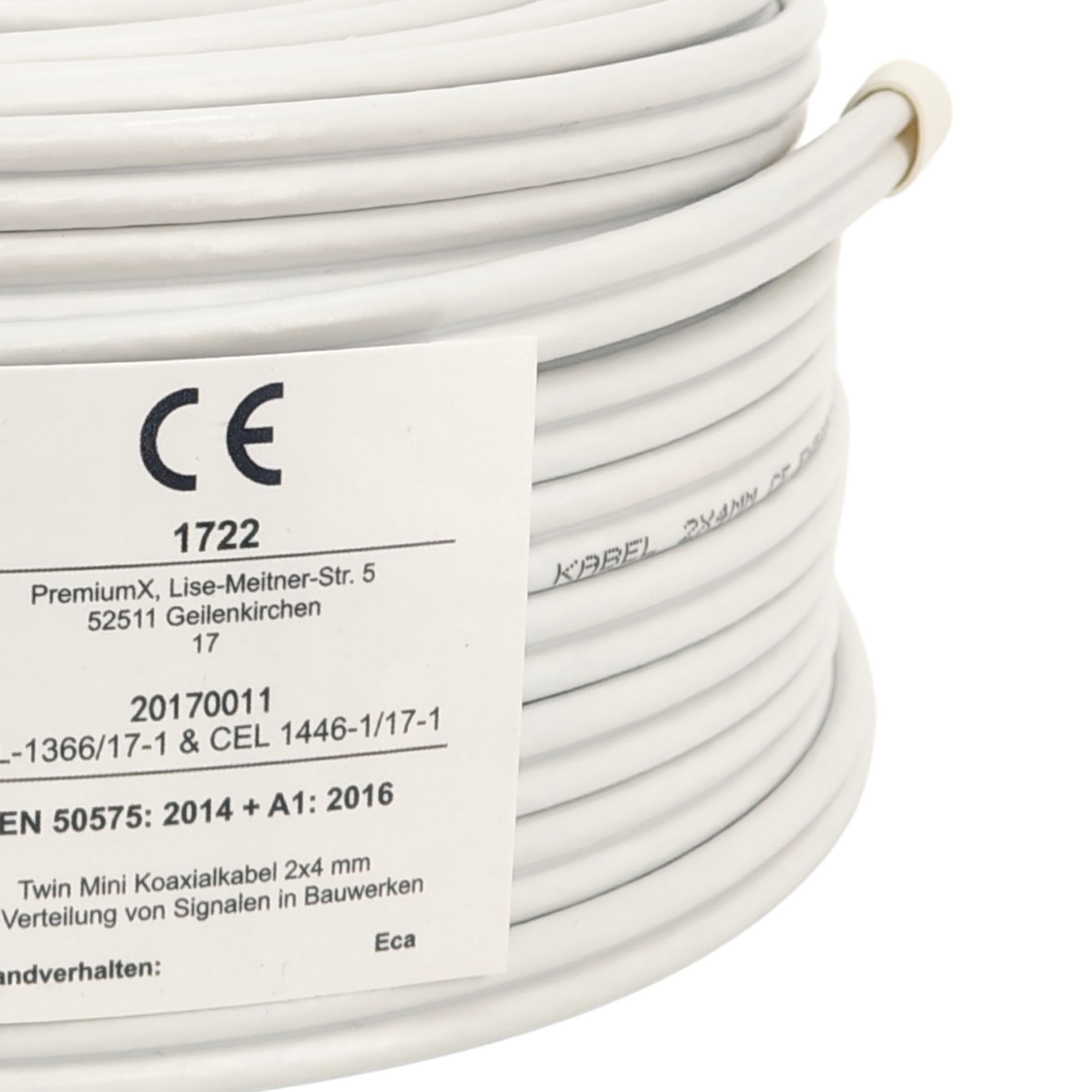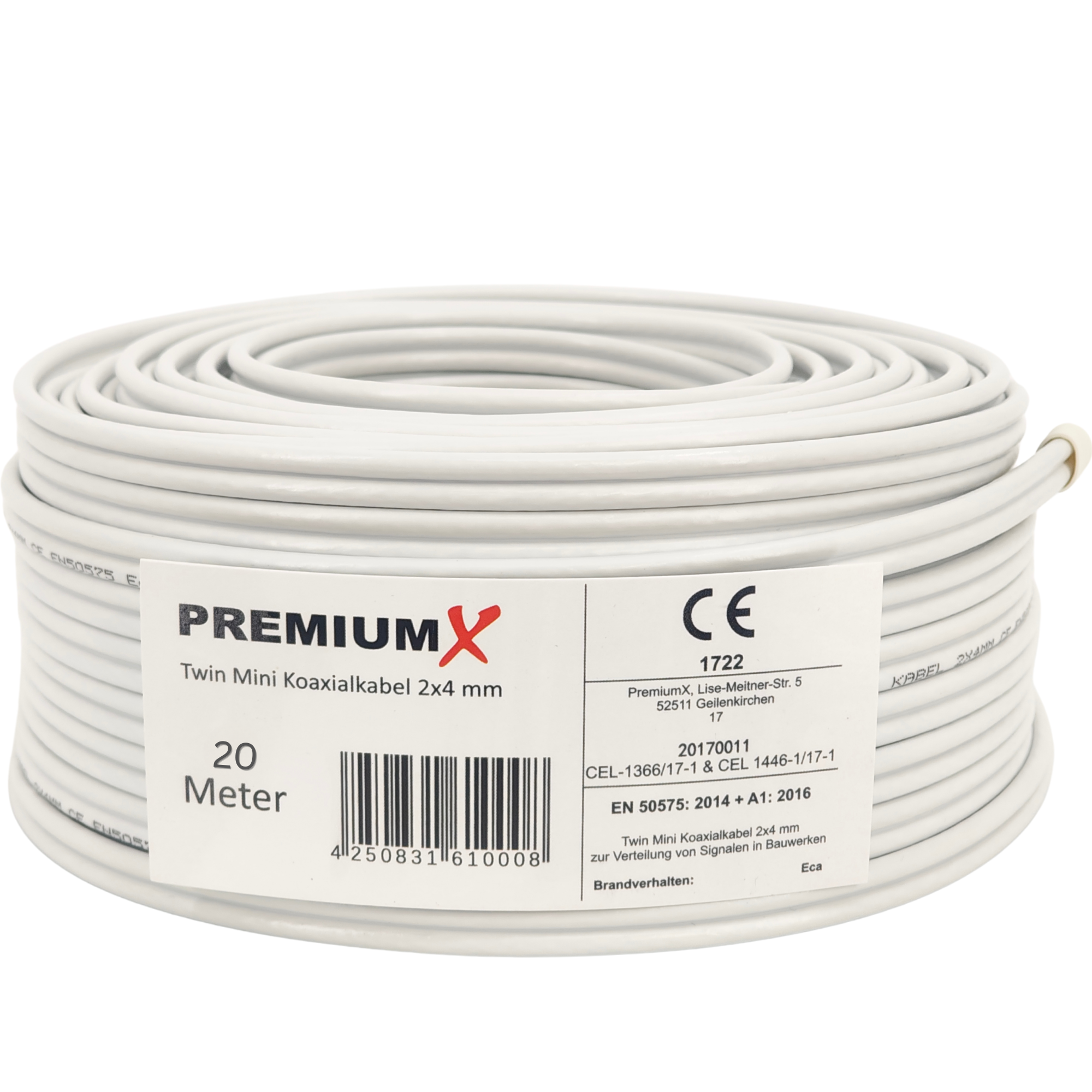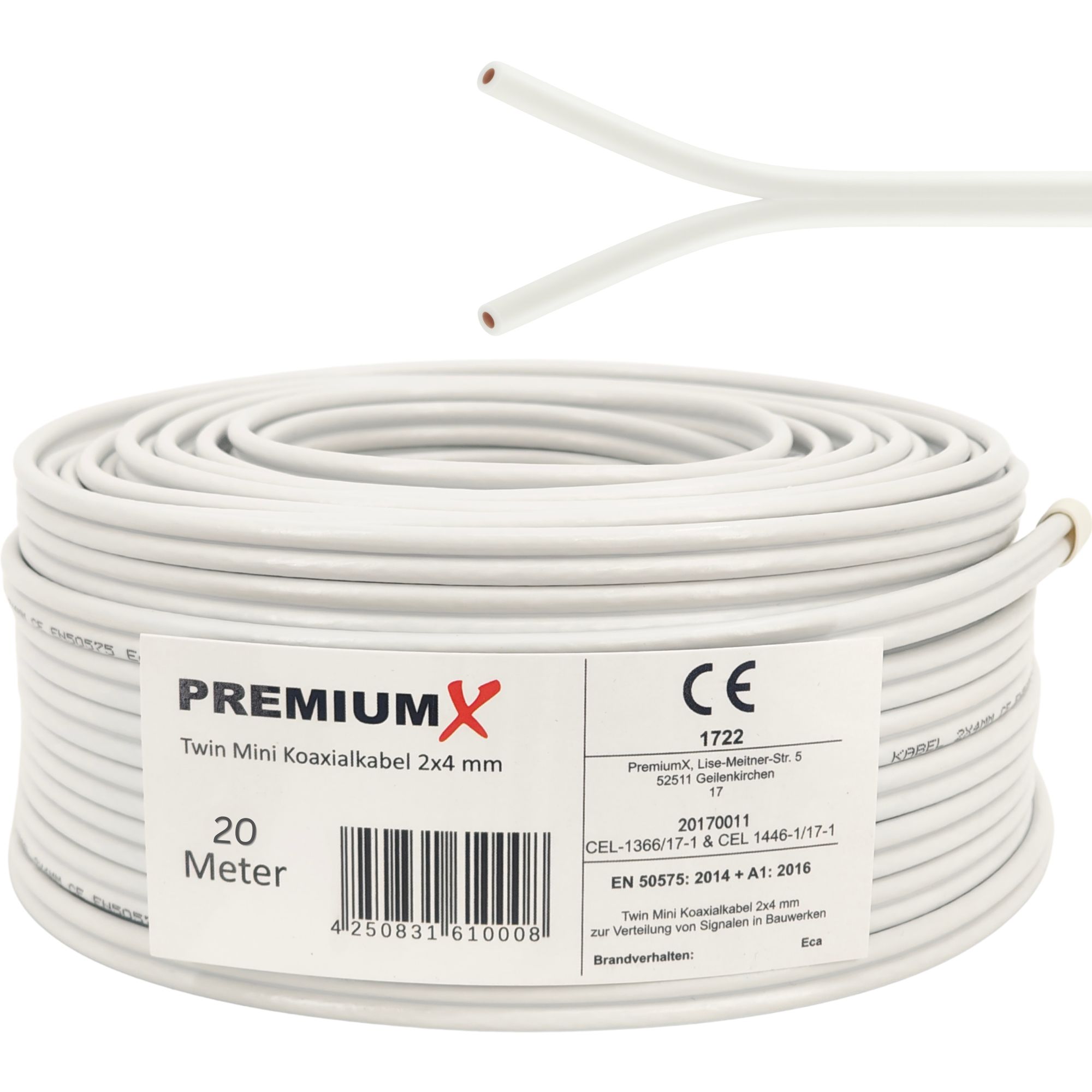 PremiumX 20m Sat Koaxial Kabel 90dB Twin Mini 2 x 4mm Weiß Antennenkabel 2-fach geschirmt
