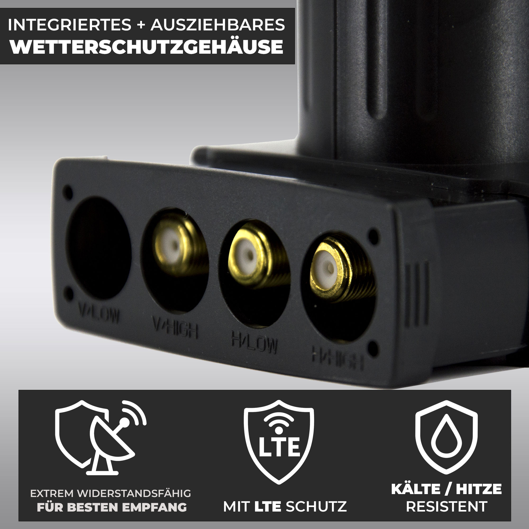 Dieses LNB zeichnet sich besonders durch seine Feed Horn Kappe aus. Diese besteht aus hochwertigem Glasfaser Material. Dank dem besonderen Empfangskopfschutz trotzt dieses LNB extremer Hitze und Wärme (bis zu 150°C). Bei klarer Witterung kann es zu extrem hohen Temperaturen am LNB Feedhorn und dessen Beschädigung kommen. Der Empfangskopf dieser besonderen PremiumX Serie wurde extra so konzipiert, dass es hohen Temperaturen problemlos Stand hält.