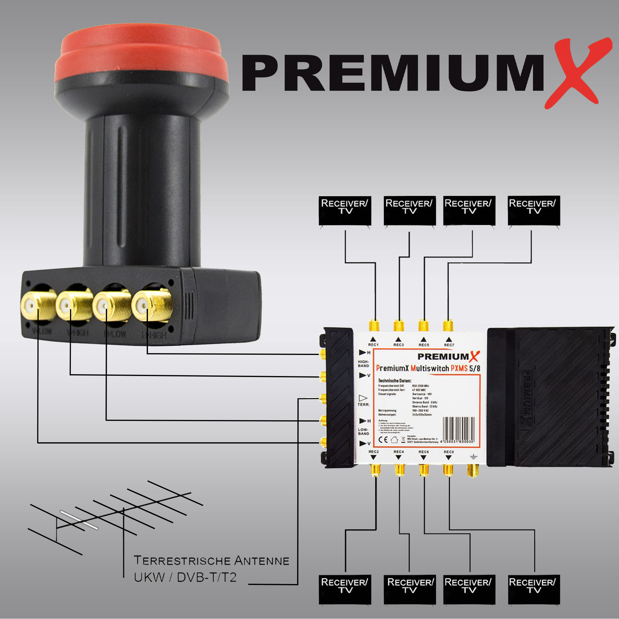 PremiumX Quattro LNB für Multischalter PX-SUN-Q DVB-S2 Sat Empfangskopf + 8x F-Stecker