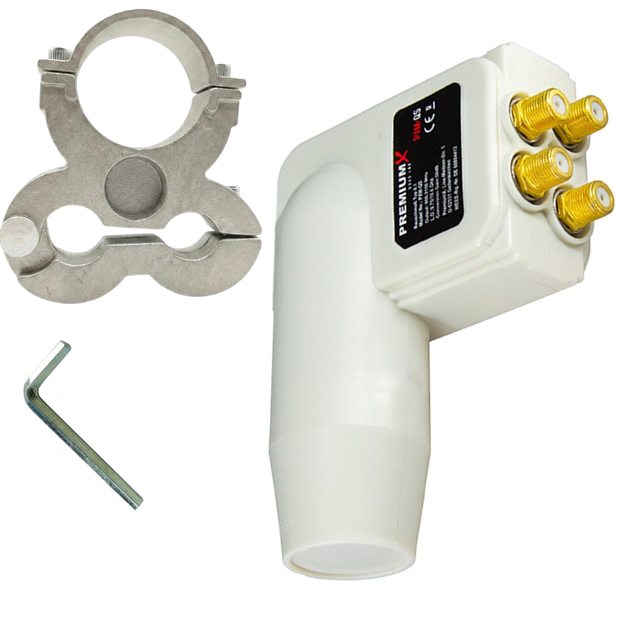 PremiumX LNB Quad 0,1 dB Weiß Quattro Switch zum Direktanschluss von 4 Teilnehmern Digital HDTV Full HD 3D + Universal Adapter für LNB Halterung 40mm auch für Technisat Antennen