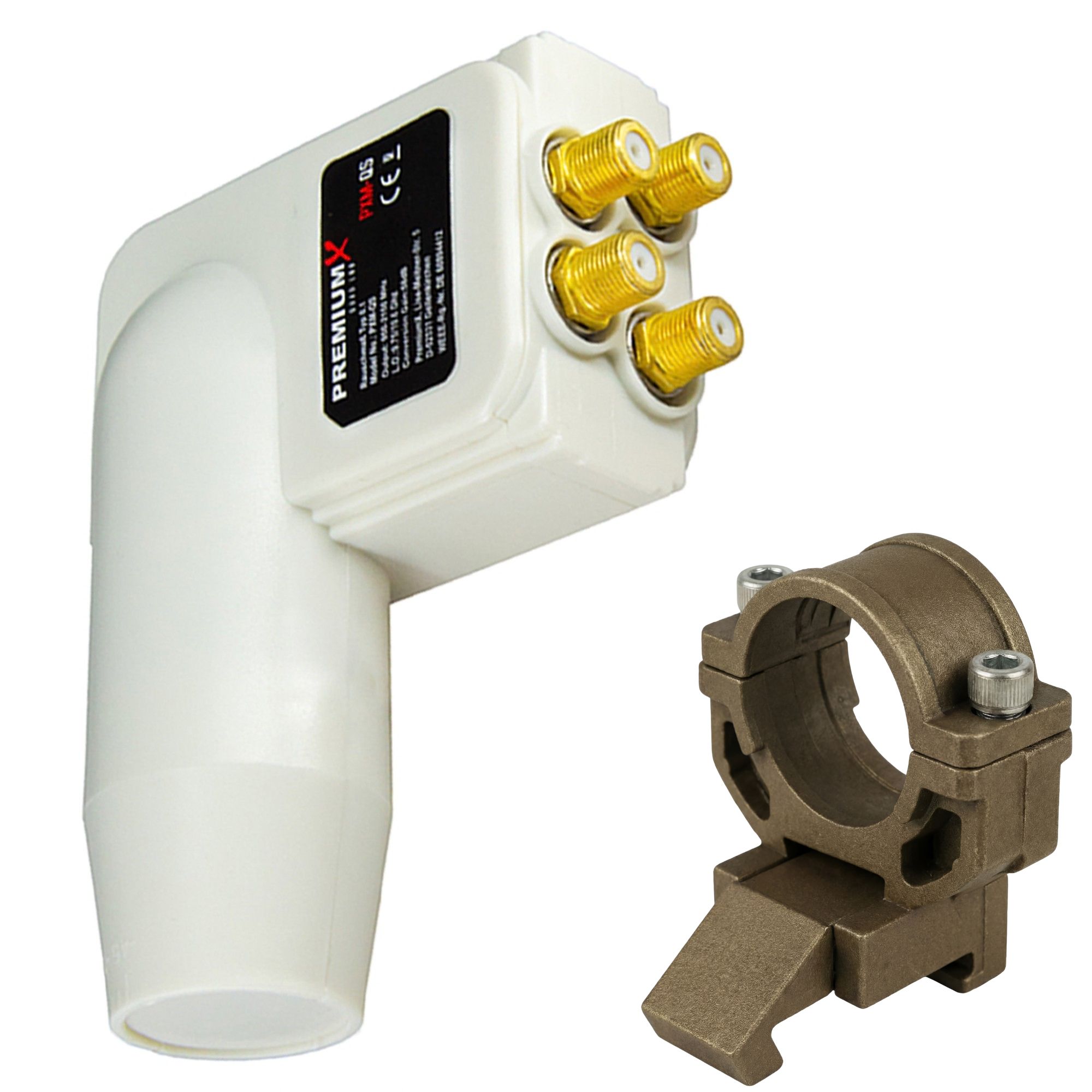 PremiumX LNB Quad 0,1 dB Weiß Quattro Switch zum Direktanschluss von 4 Teilnehmern Digital HDTV Full HD 3D + Universal Adapter für LNB Halterung auch für Kathrein Antennen