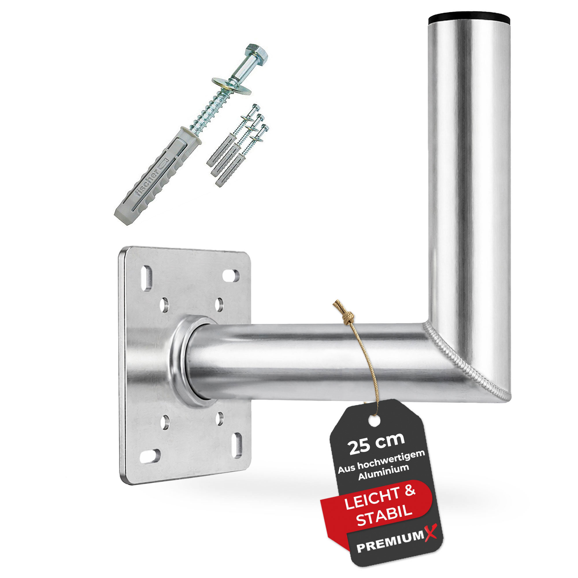 Die Aluminium Wandhalterung von PremiumX ist die perfekte Wahl, um Ihre Sat-Anlagen, DVB-T/T2 oder LTE Antennen zu befestigen. Die Halterung ist aus hochwertig verarbeitetem Aluminium gefertigt und zeichnet sich durch ihre hohe Qualität, Stabilität und Witterungsbeständigkeit aus. Das rostfreie Aluminium sorgt für eine besonders lange Lebensdauer. Die Montage ist dank der Langlöcher (15x10 mm) und der vorhandenen Mastkappe, die die Halterung vor Feuchtigkeit schützt, einfach und stressfrei. Die offene Wandseite des Rohrs ermöglicht eine problemlose Durchführung der Kabel. Unsere Wandhalterung ist geprüft und bietet Ihnen höchste Sicherheit und Zuverlässigkeit.