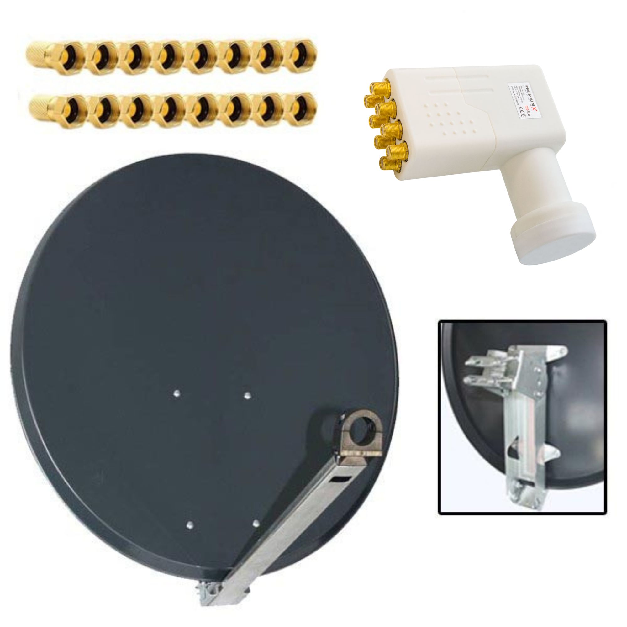 PremiumX XTA 85cm SAT Antenne ALU Schüssel Spiegel Anthratzit mit LNB Octo zum Direktanschluss von 8 Teilnehmern Digital HDTV FullHD 4K tauglich + 16 F-Stecker vergoldet