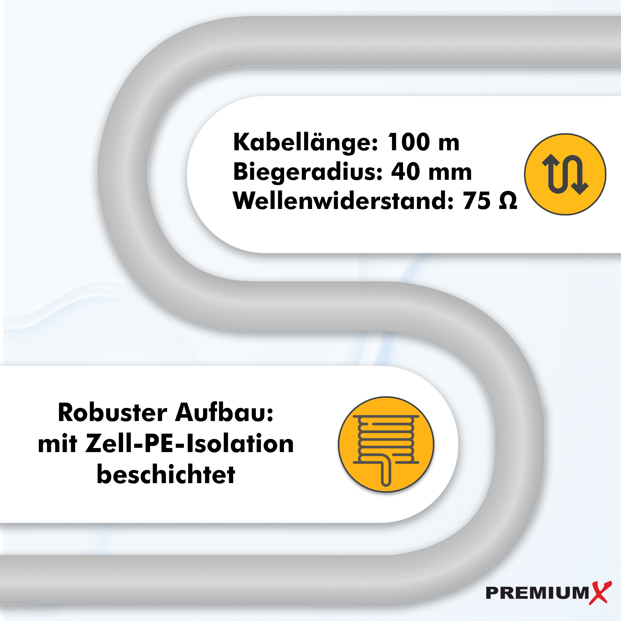 PremiumX 100m DELUXE PRO 100m Koaxial Kabel 135 dB 5-Fach geschirmt reines Kupfer SAT Antennenkabel