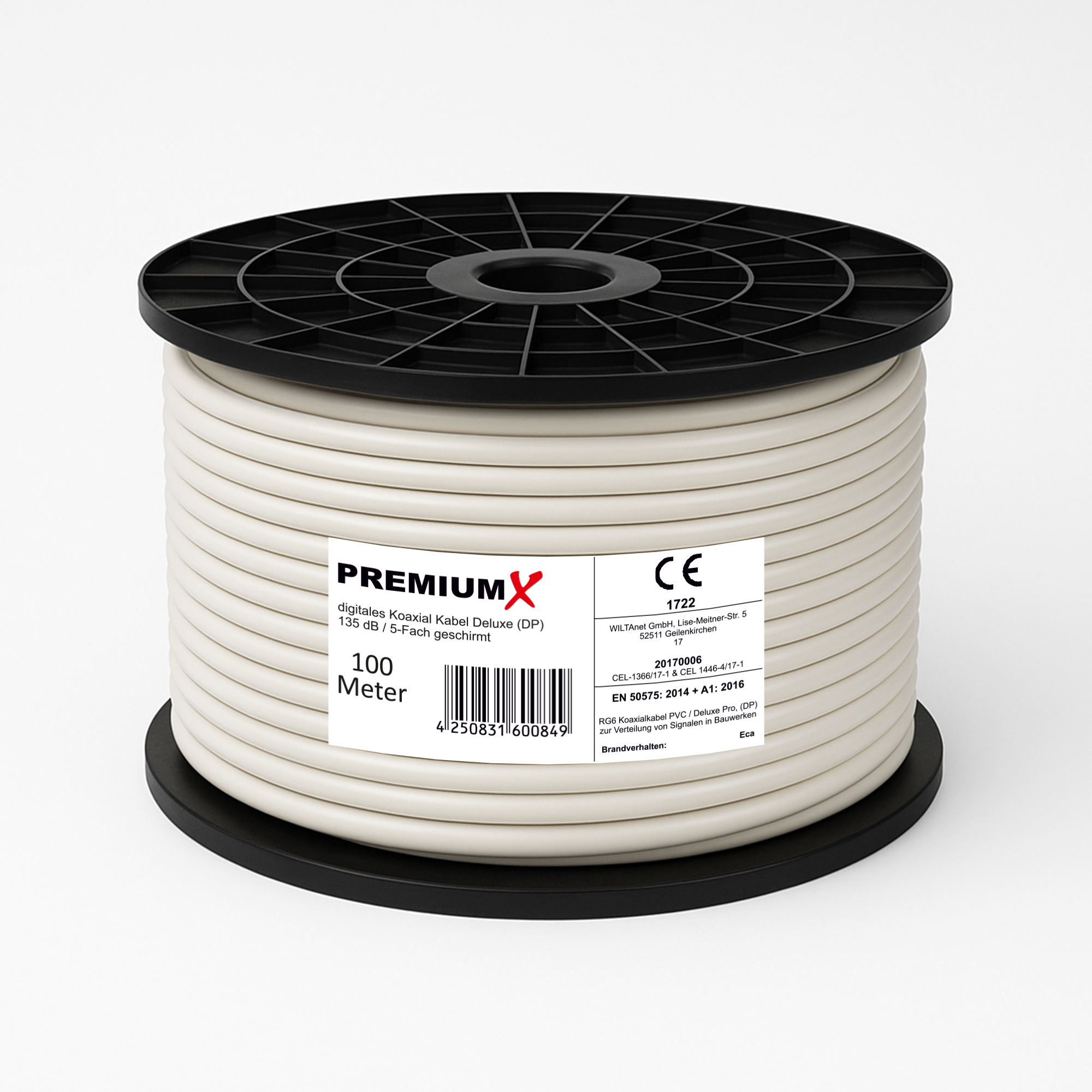 Mit einem Wellenwiderstand von 75 Ohm, einem hohen Verkürzungsfaktor von mindestens 0,80 sowie einem Biegeradius von nur 40 mm erfüllt das PremiumX DELUXE PRO Koaxialkabel alle Anforderungen an eine professionelle, sichere und zukunftssichere Installation im Innenbereich.
