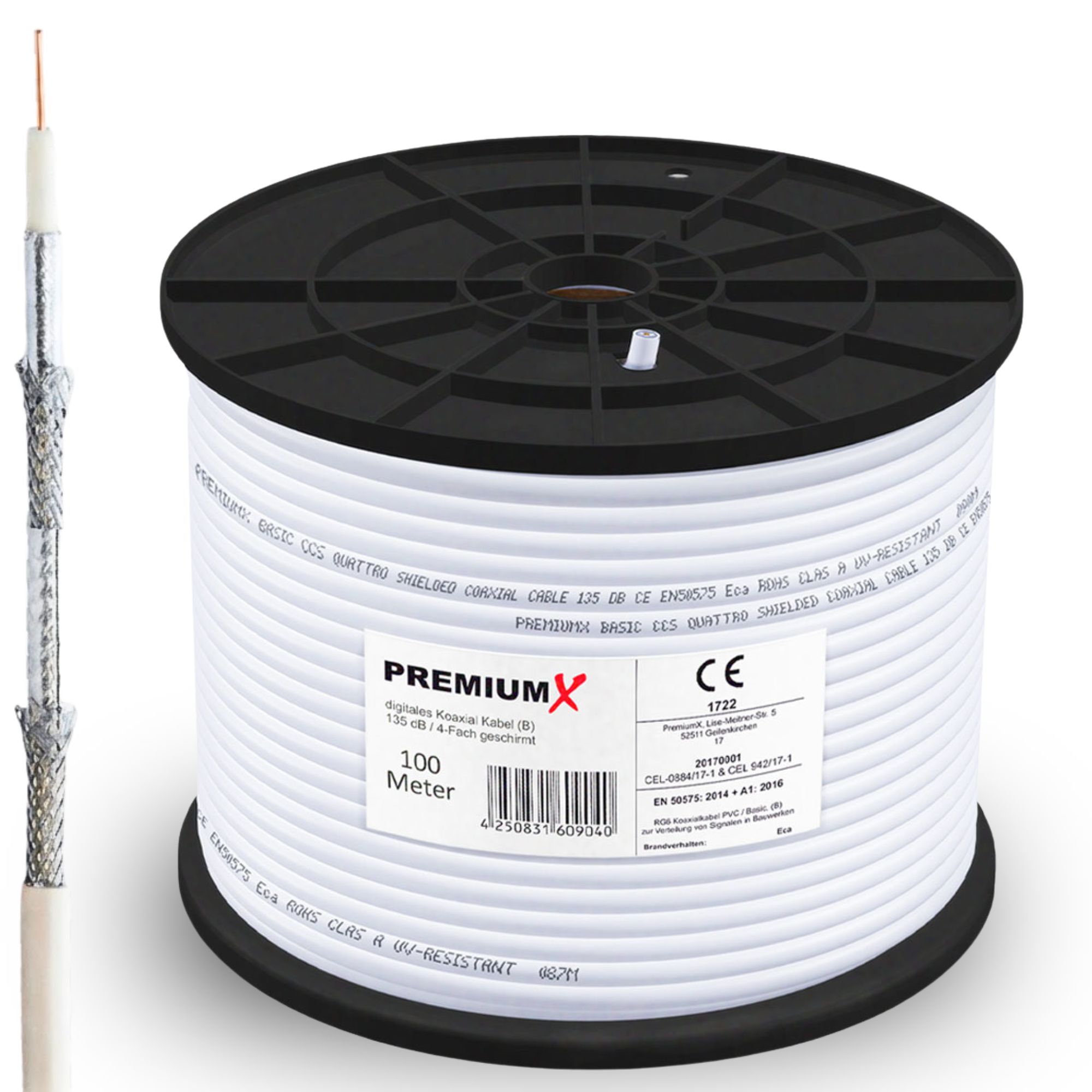 PremiumX 100m BASIC Koaxialkabel 135dB 4-fach CCS SAT Kabel Antennenkabel