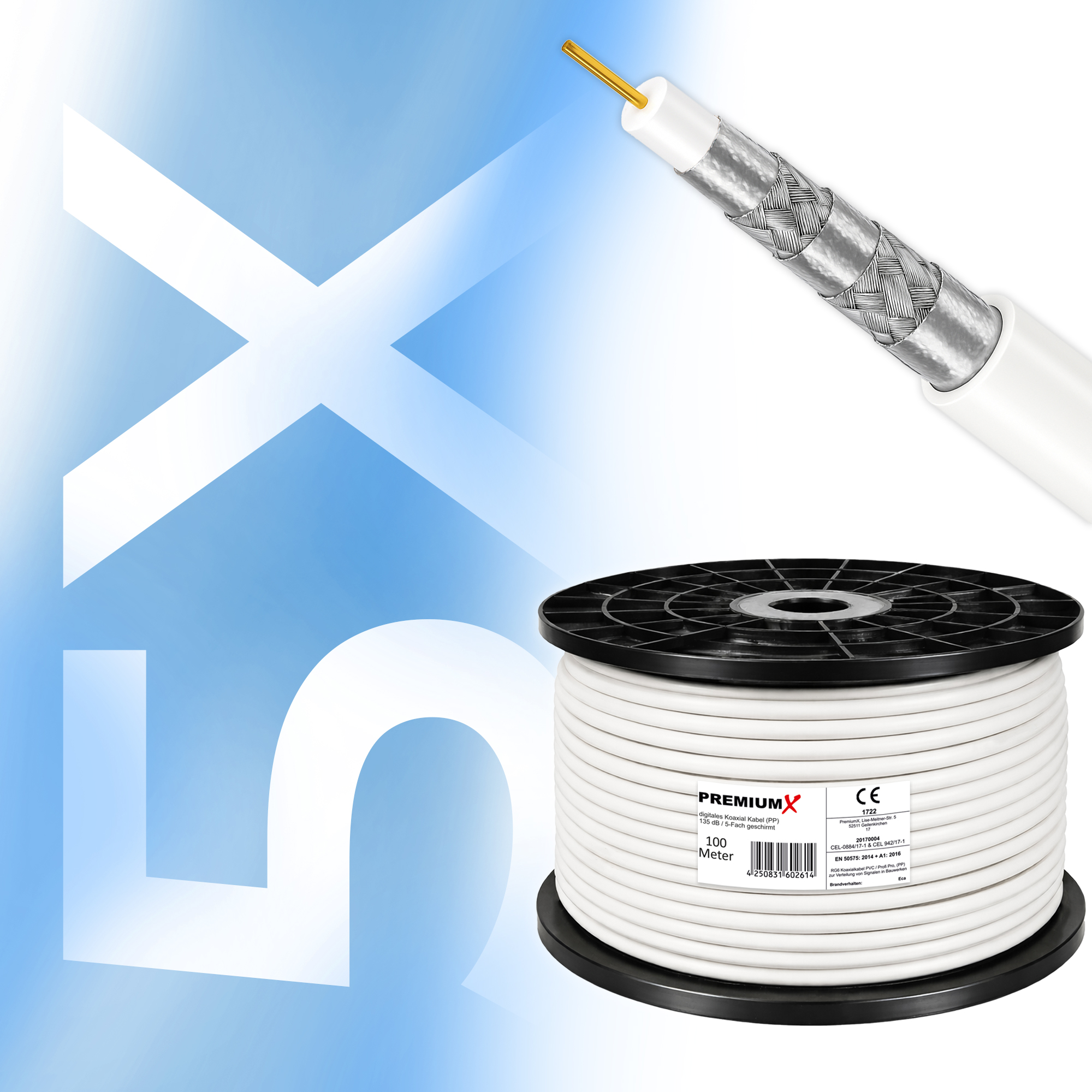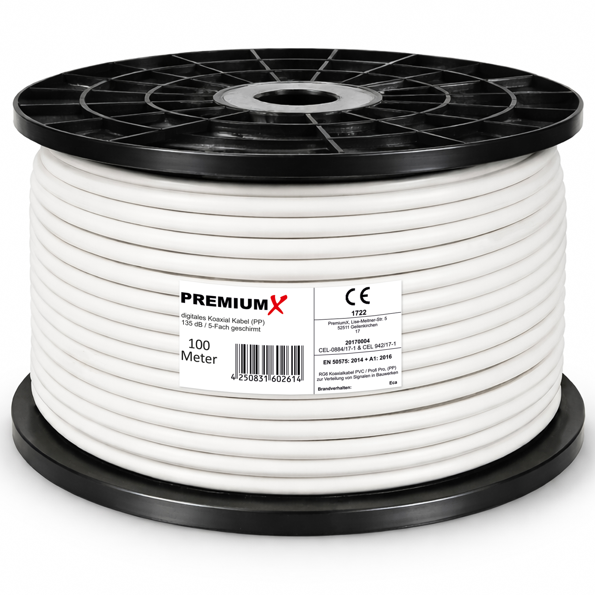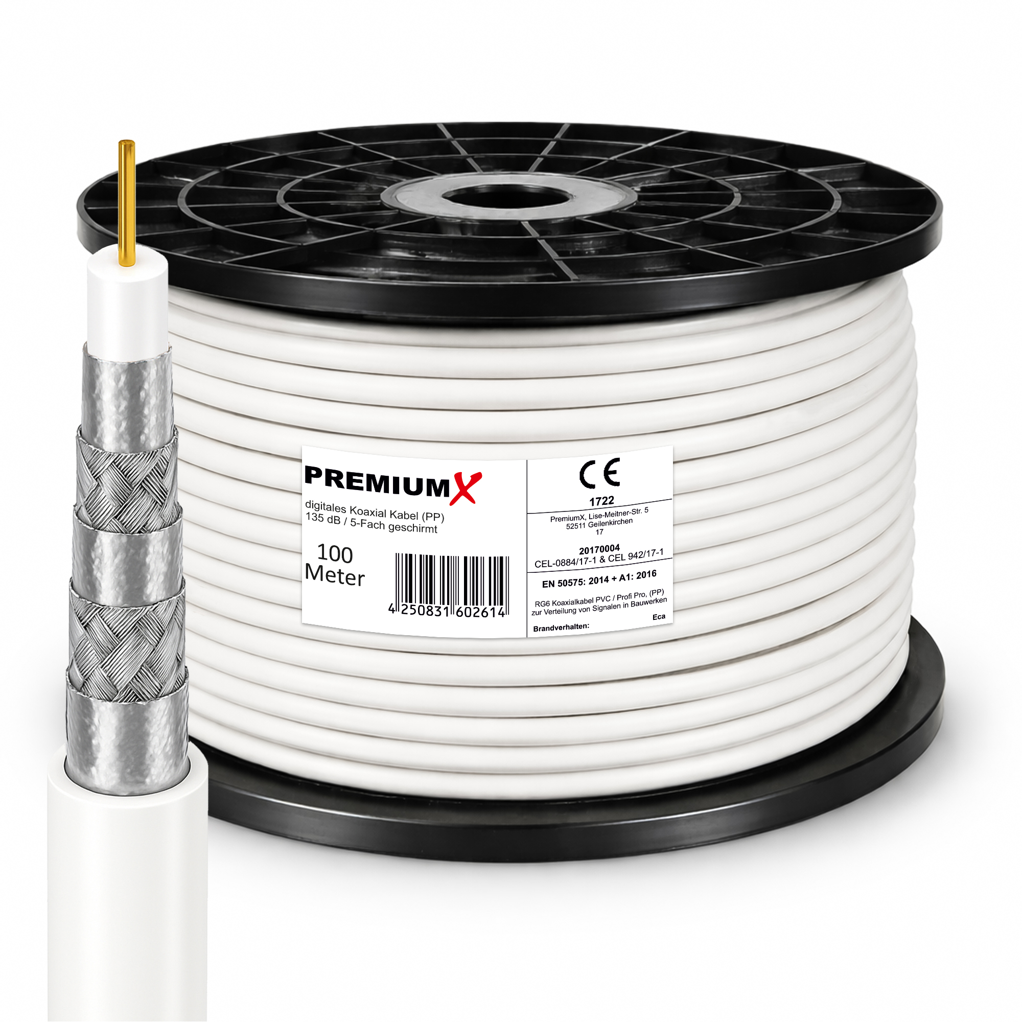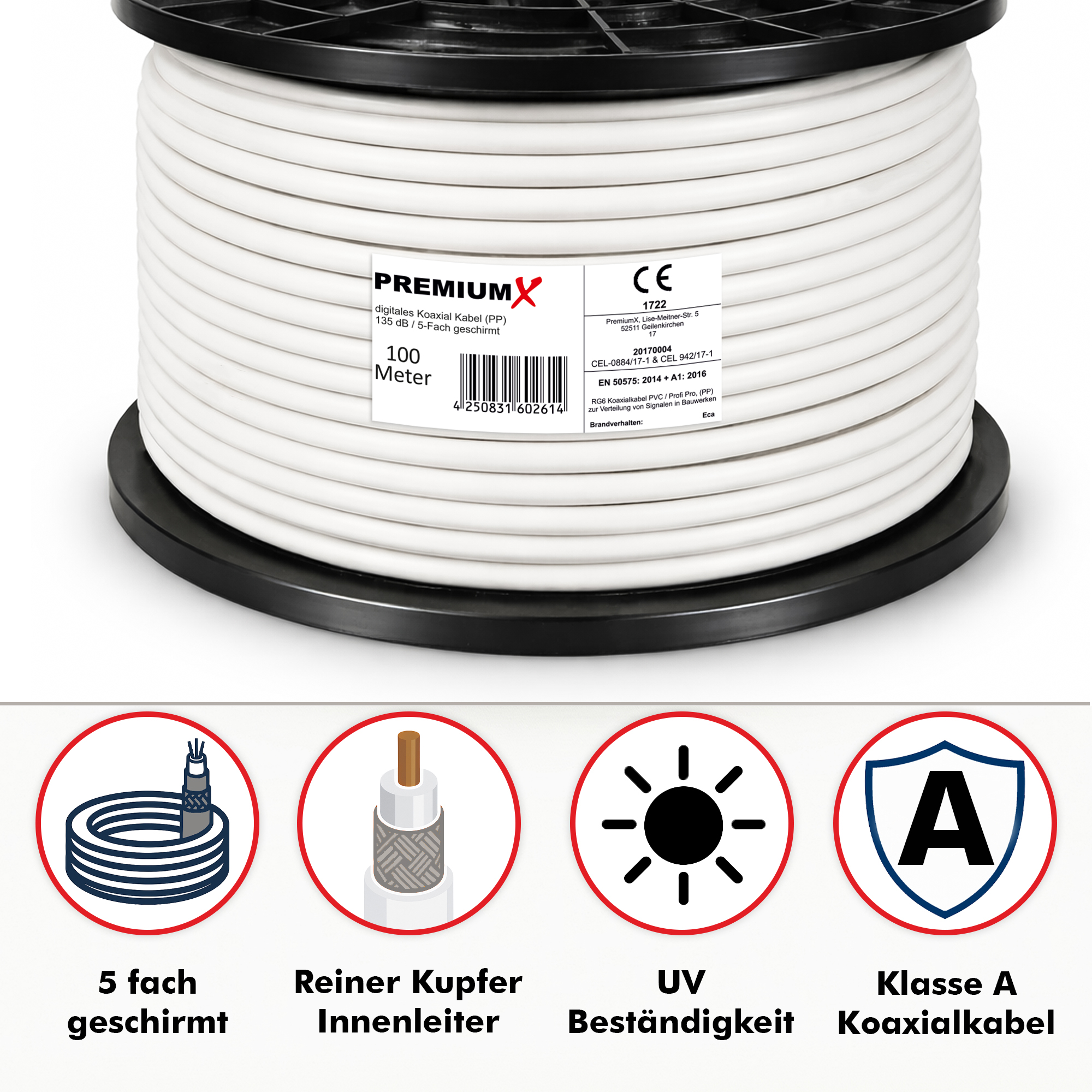 PremiumX 100m PROFI PRO Koaxial Kabel 135dB 5-Fach geschirmt, reines Kupfer SAT Antennenkabel