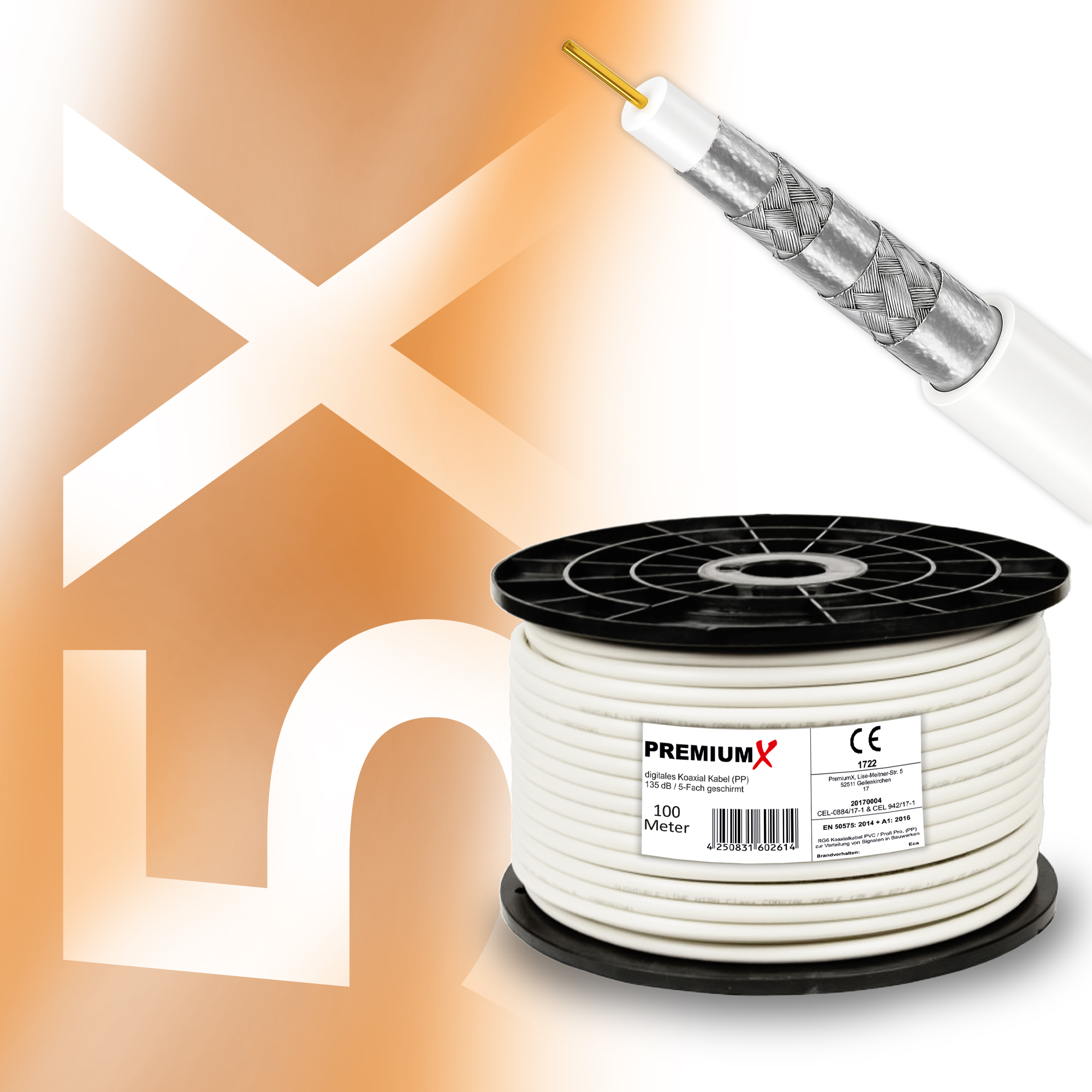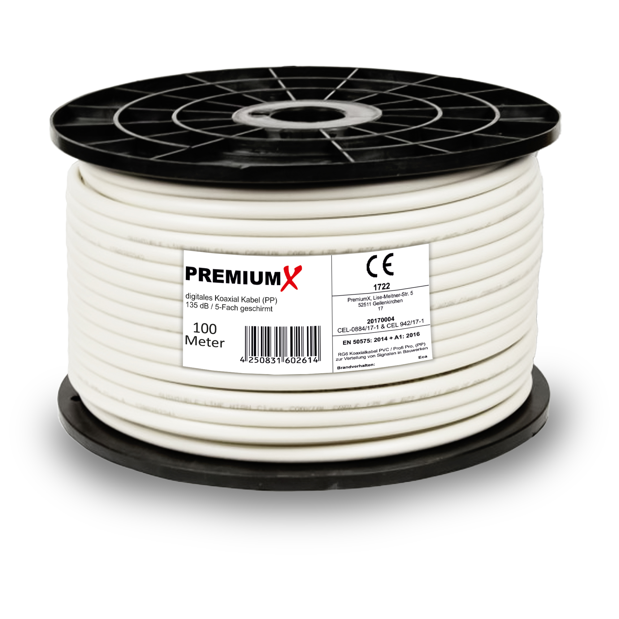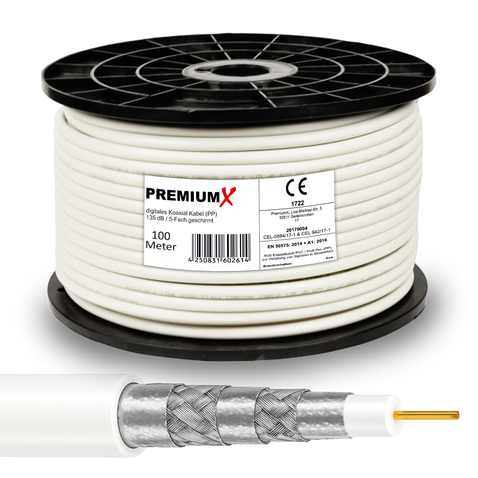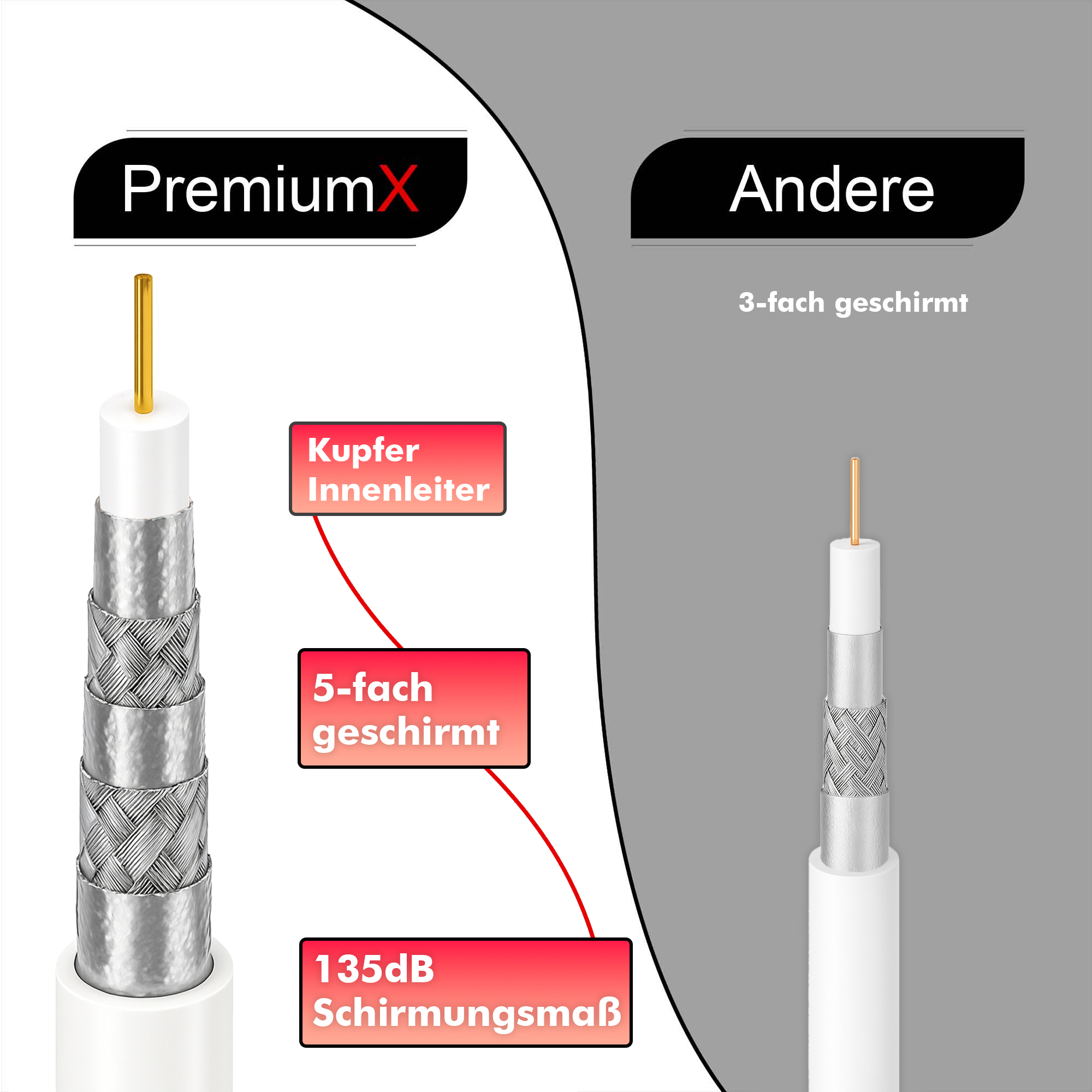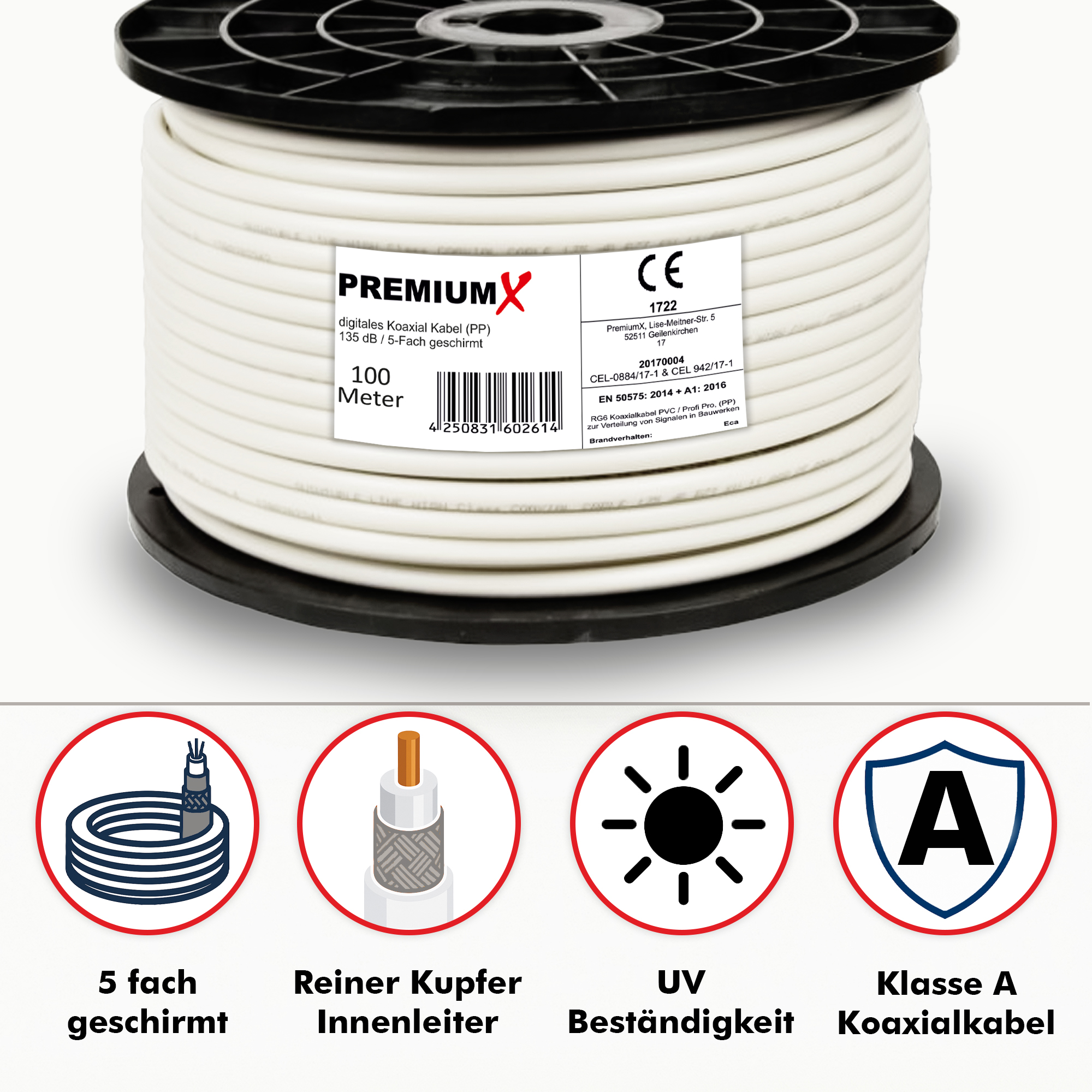 PremiumX 100m PROFI PRO Koaxial Kabel 135dB 5-Fach geschirmt, reines Kupfer SAT Antennenkabel