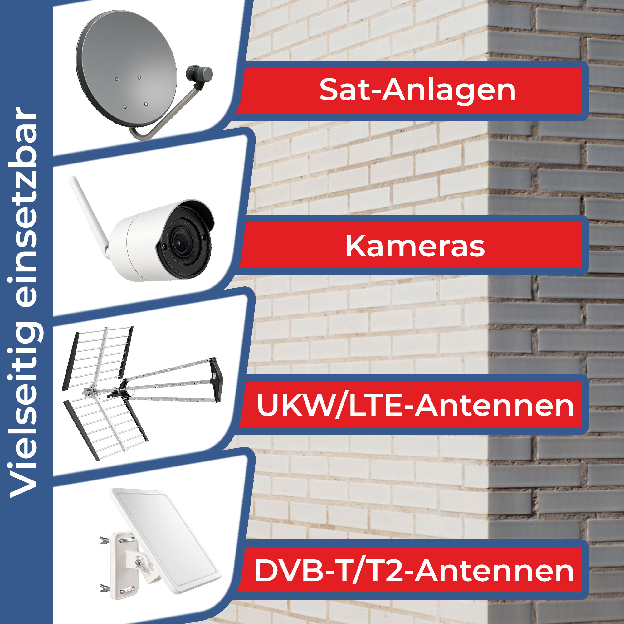 Unsere Wandhalterung aus hochwertig verarbeitetem verzinktem Stahl ist die ideale Lösung für Ihre Sat-Anlagen, DVB-T/T2 oder LTE Antennen. Sie zeichnet sich durch ihre hohe Qualität, Stabilität und Witterungsbeständigkeit aus. Das verwendete verzinkte Stahl ist rostfrei und somit besonders langlebig. Dank der stressfreien Montage mit Langlöchern und der vorhandenen Mastkappe, die die Halterung vor Feuchtigkeit schützt, ist die Installation ein Kinderspiel. Die offene Wandseite des Rohrs ermöglicht zudem eine problemlose Durchführung der Kabel. Investieren Sie in PremiumX und genießen Sie eine robuste und zuverlässige Befestigung Ihrer Antenne.