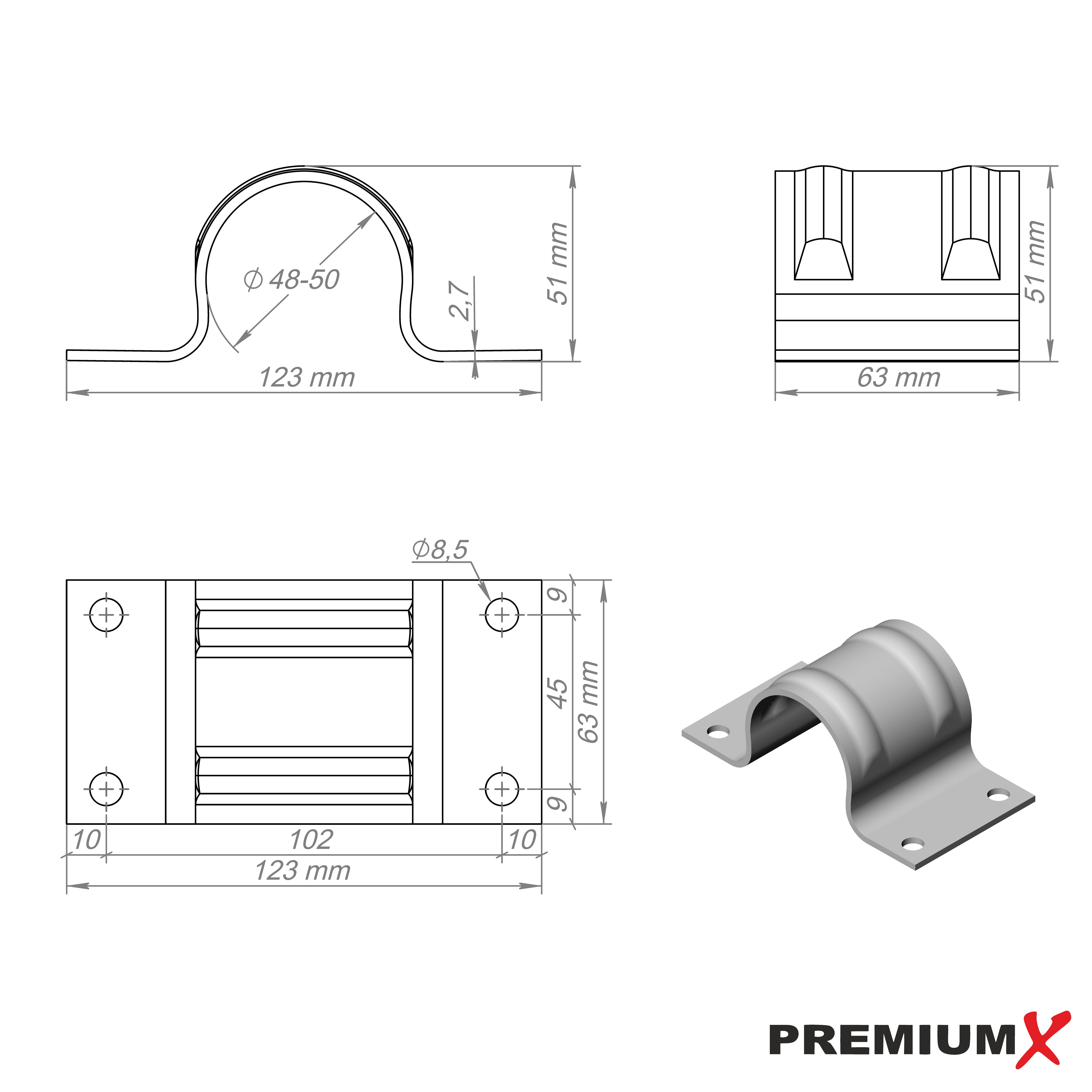 PremiumX Mastschelle mit 4 Befestigungslöchern aus verzinktem Stahl für Antennenmast mit Durchmesser 48 - 50 mm.