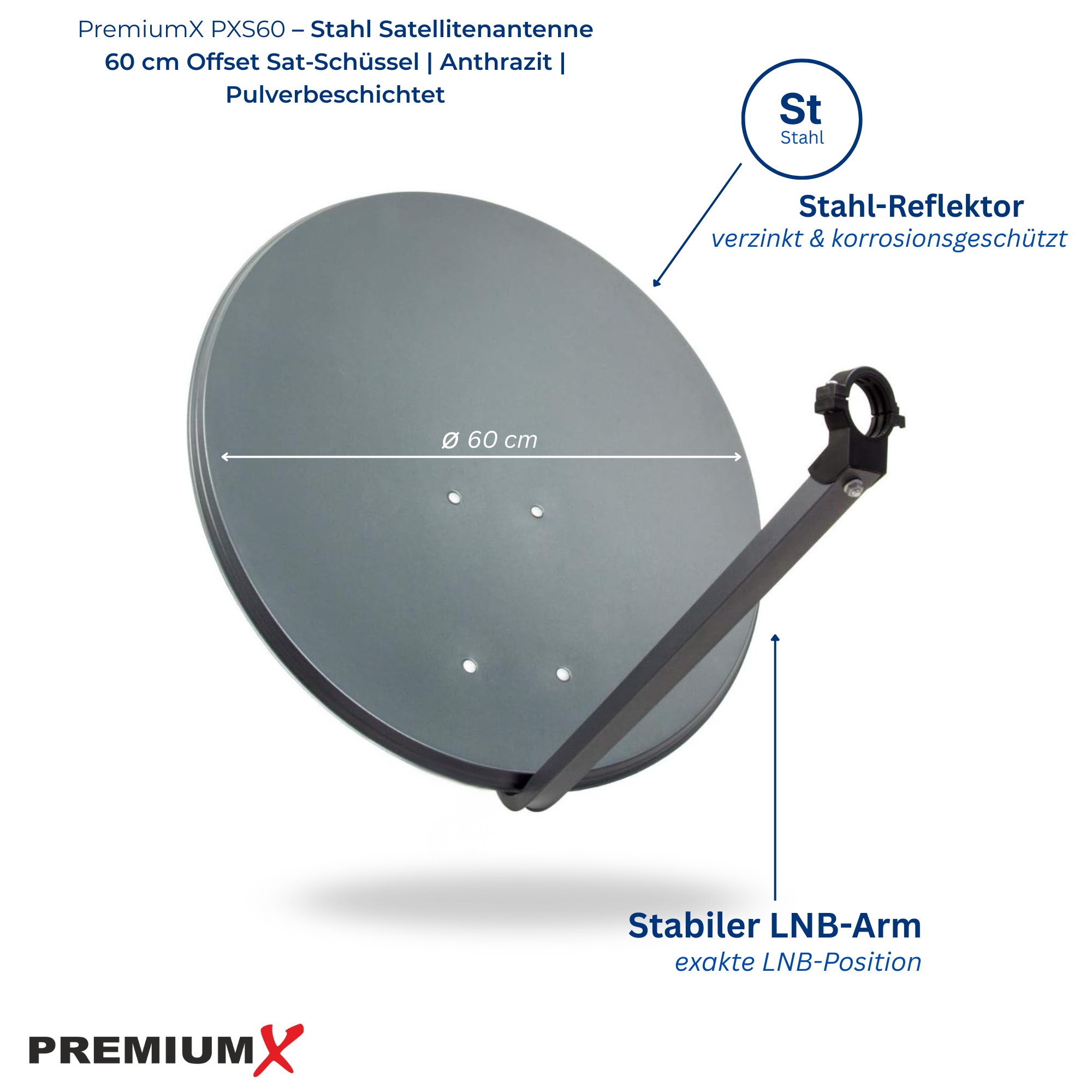 PremiumX PXS60 Satellitenschüssel 60cm Stahl Anthrazit Satellitenantenne SAT Spiegel