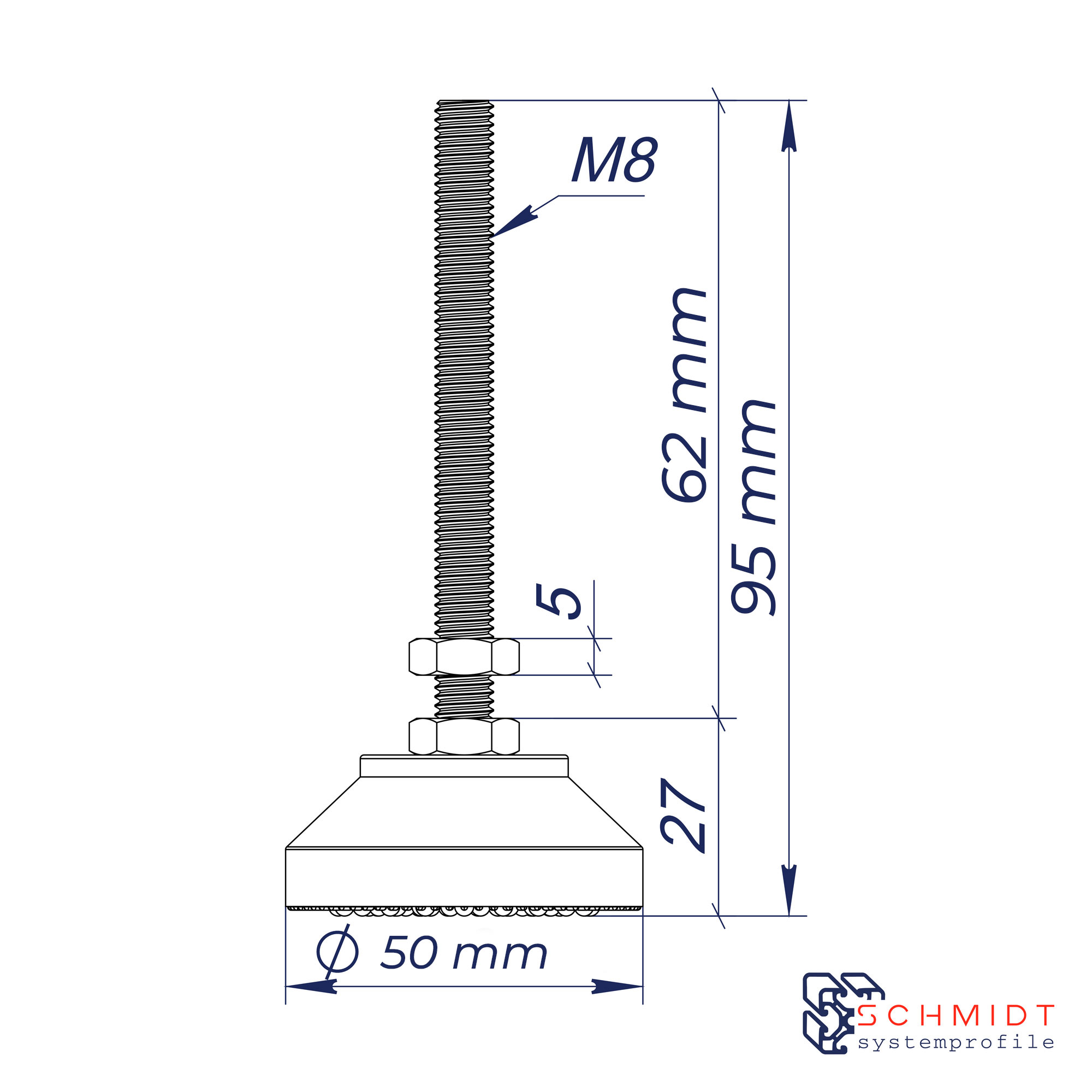 Stellfüße haben eine verzinkte M8 Stahlschraube mit einer Gewindelänge von 47,4 mm - diese kann an Aluminiumprofilen befestigt und die Höhe mit einem Sechskantschlüssel entsprechend eingestellt werden.