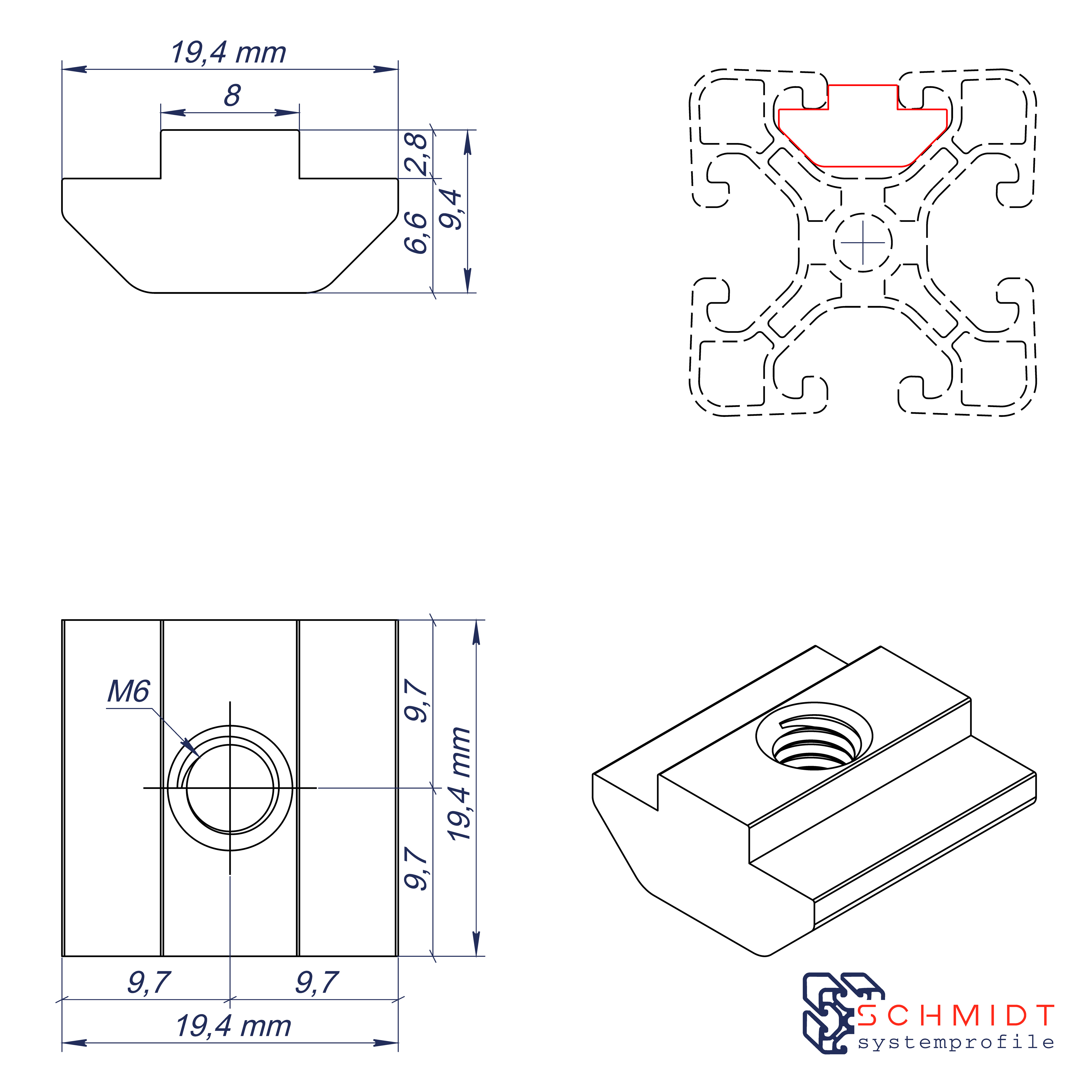 SCHMIDT systemprofile 50x Nutenstein M6 Nut 8 Stahl verzinkt Gleitmutter mit Steg